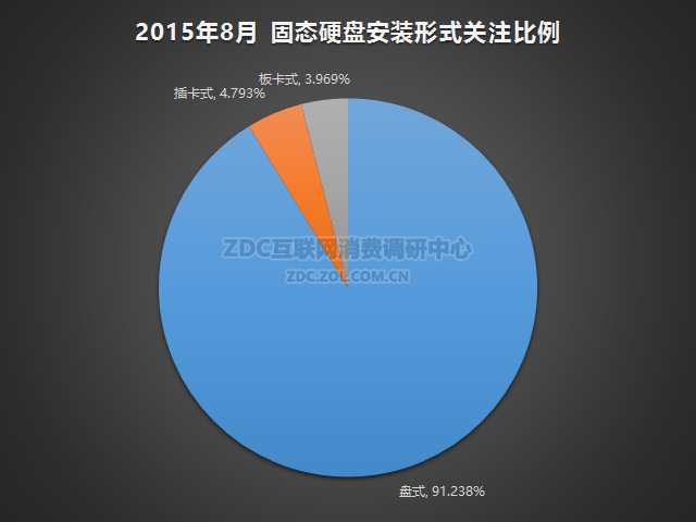 ZDC调查显示,2015年8月的固态硬盘市场上,盘式固态硬盘占有绝对优势,关注度比例为91.238%,而插卡式为4.793%,板卡式为3.969%。