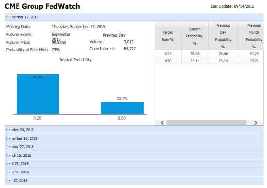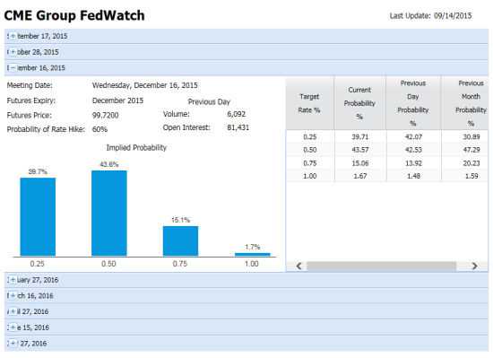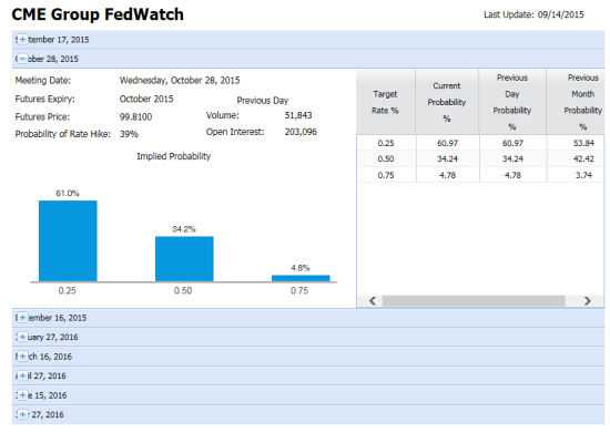 在笔者看来,美国加息与否最佳的风向标还是要看市场,在芝加哥商品交易所(CME)有一个针对美联储基准利率(FedFund Rate,即美联储贷款给商业银行的短期利率)的衍生品——美联储基准利率期货市场(Fed Fund futures),参与交易的主要是全球的机构投资者。
