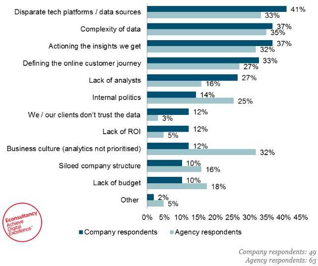“技术平台差异”越来越成为网络营销各领域的阻碍,归因分析也不例外,41%的受访企业谈到了这一点。