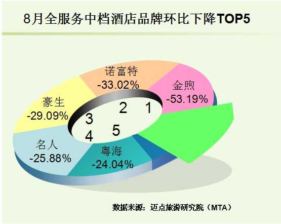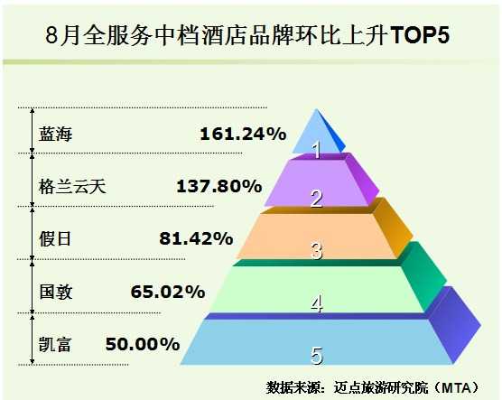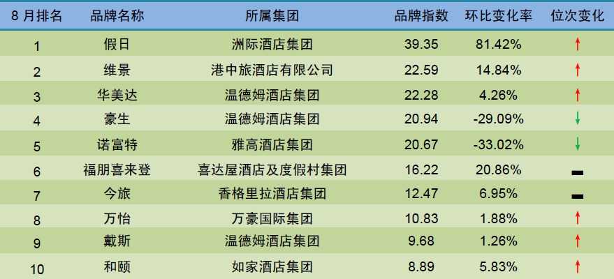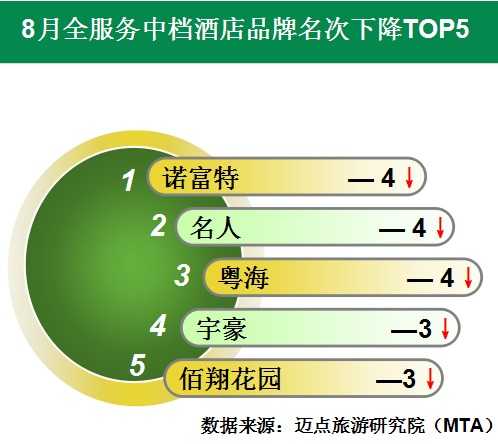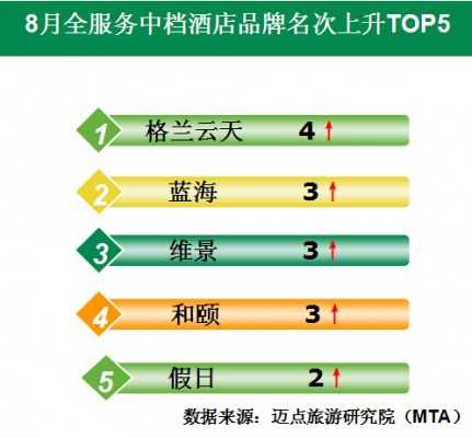 2015年8月,根据迈点旅游研究院(MTA)对全服务中档酒店品牌品牌指数的不完全统计,本月全服务中档酒店品牌风云榜TOP10依次是假日、维景、华美达、豪生、诺富特、福朋喜来登、今旅、万怡、戴斯以及和颐。