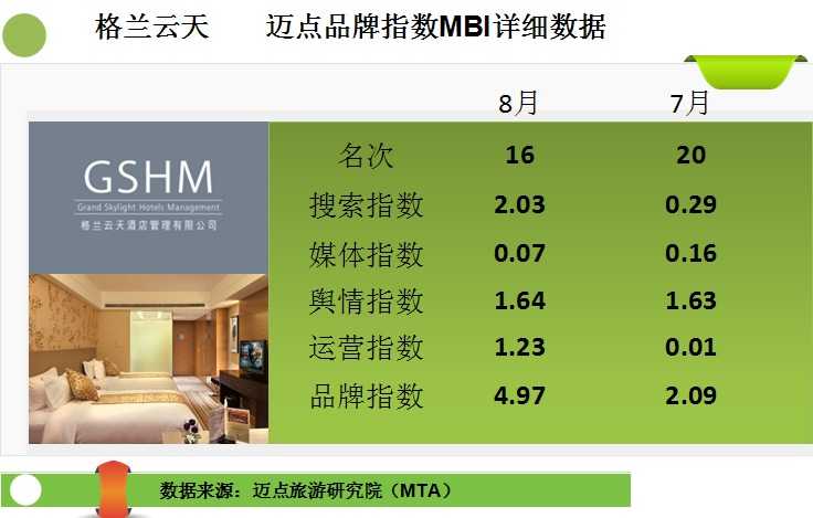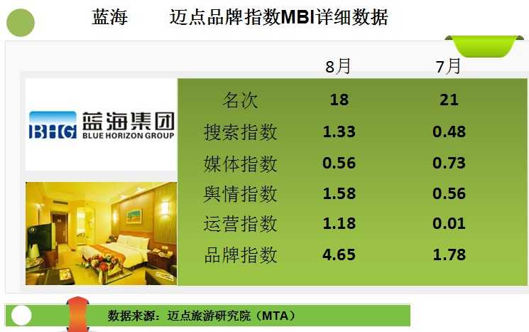 迈点品牌指数MBI(酒店品牌部分)是由迈点网独家发布,用以反映一段时期内酒店品牌在互联网和移动互联网的影响力的指标数据,可为企业及行业相关人士分析品牌传播及营销管理提供参考。迈点品牌指数MBI主要从搜索指数、舆情指数、运营指数、媒体指数4个维度分析品牌在互联网和移动互联网的在影响力。这是迈点网基于迈点旅游研究院自主开发的“迈点品牌指数监测系统” Meadin Brand Index Monitoring System(MBIMS)提供的一项免费数据分析服务。