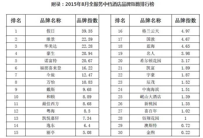 附录:2015年8月全服务中档酒店品牌指数排行榜