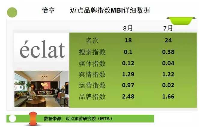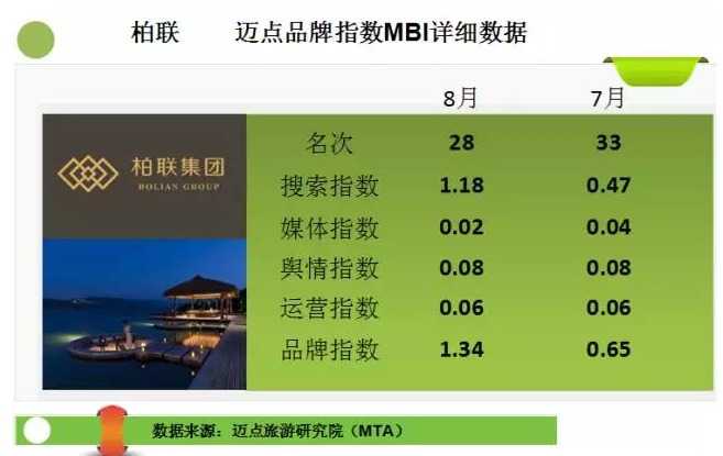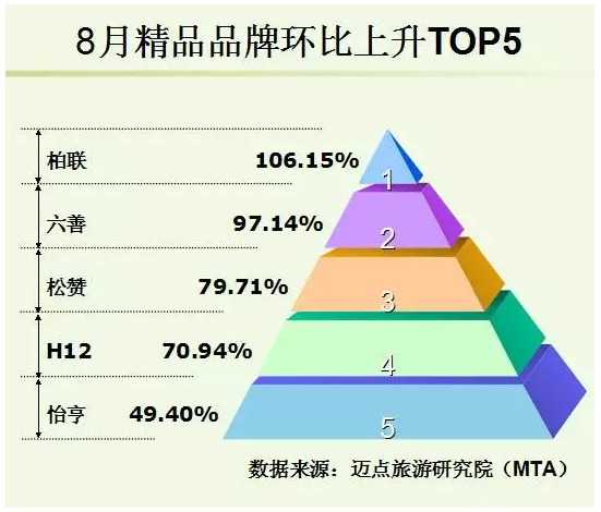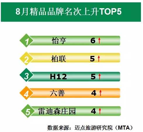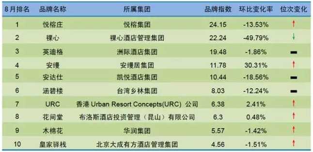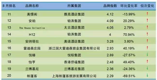 (2)从名次变化看,8月名次上升的品牌数量有22个,下降和持平的品牌数量则分别有13个和3个。其中怡亨品牌位次较上月上升最为显著,共上升6位。柏联和H12较上月均上升5位,位列第二和第三。另外,六善和雷迪森庄园较上月均上升4位,分列位次上升榜单的第四、第五位。
