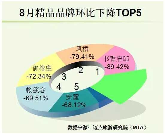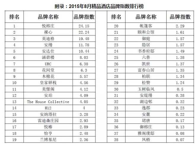 2015年8月,根据迈点旅游研究院(MTA)对精品酒店品牌品牌指数的不完全统计,本月精品酒店品牌风云榜TOP10依次是悦榕庄、裸心、英迪格、安缦、安达仕、涵碧楼、URC、花间堂、木棉花以及皇家驿栈。