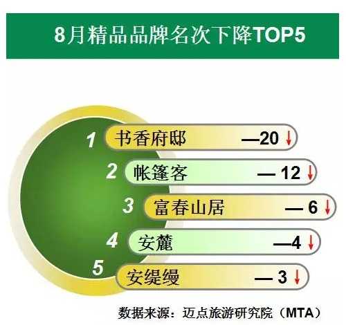下降榜单中,书香府邸品牌下降幅度最大,较上月下降20位。帐篷客品牌下降12位,紧随其后。富春山居、安麓和安缇缦分别较上月下降了6个、4个和3个位次,分列位次下降榜单的第三至第五位。