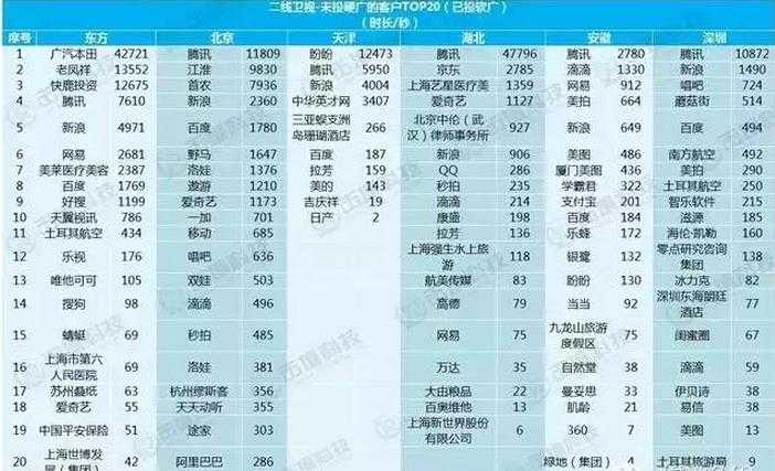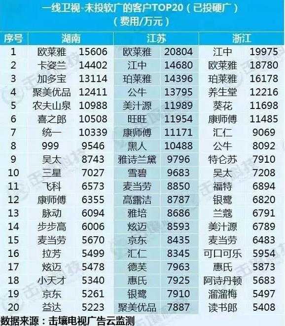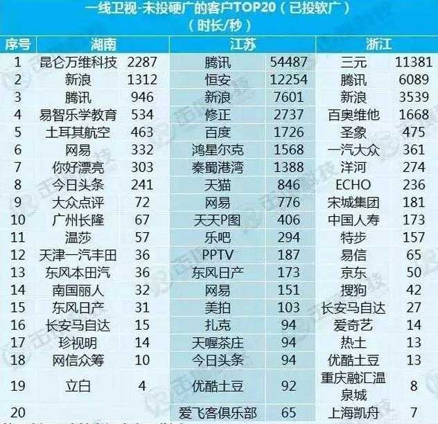 省级卫视中,根据2015年1月-8月16日的频道投放硬广情况,大致可以整理出以下两个表格(未投放软广的客户)。