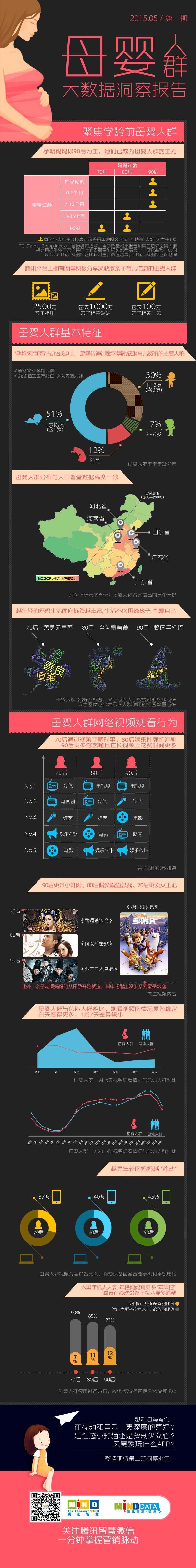 腾讯智慧:母婴人群收视习惯与市场 腾讯智慧将镜头对准腾讯平台上的母婴人群,聚焦70后、80后、90后中从孕期到学龄前宝宝的妈妈们,挖掘她们的人群特征以及在网络上的各类行为,描绘出母婴人群的网络生活基本形态。 (注:本报告所指母婴人群皆为2015年一月至三月在腾讯平台上的活跃人群,涵盖20-45岁、目前正处孕期或拥有至少一个6岁(含)以内孩子的女性。其中,70后指36-45岁,80后指26-35岁,90后指20-25岁。) 更多阅读:腾讯智慧:移动营销立足本地转化 腾讯智慧零售出席2021中国国际零售创新大会 以私域业态助力零售新增长腾讯智慧:中国1-4线城市互联网用户价值分布图腾讯智慧:在中国在线视频观看时间已超越电视腾讯智慧:“沙发电子商务”时代到来,你准备好了吗?腾讯智慧:品牌内容营销正当时 腾讯智慧:网络视频 不可忽视的价值金矿腾讯智慧:数百万妈妈人群总是手机在线剧烈的消费转型正在发生:直击中国消费品市场未来最大的机遇Geoscape:2017年美国市场数据报告eMarketer:中国领跑全球电子商务市场2014年中国移动广告市场比2013年增长七倍即时通信APP市场的五点总结:亚洲市场火热一张图教会移动开发商如何争夺未来App市场—信息图eMarketer:预计2014年中国仍主宰亚太地区数字广告市场