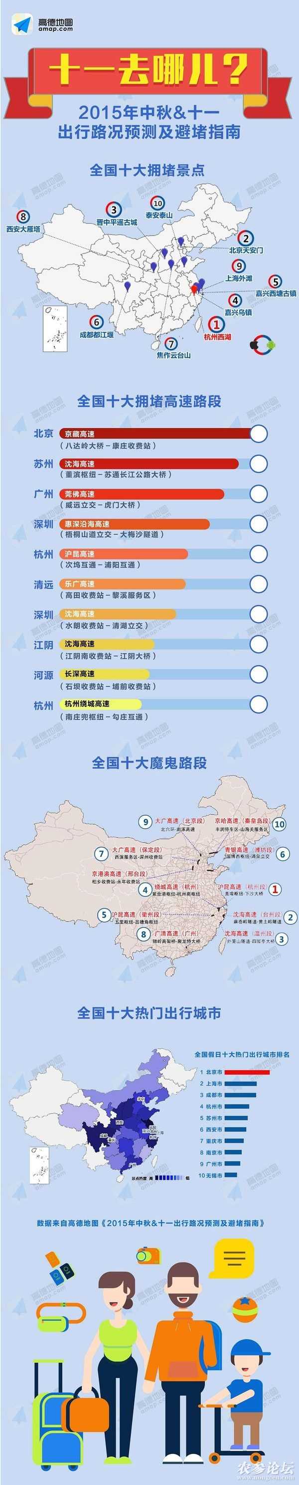 高德地图发布《2015年中秋&十一出行路况预测及避堵指南》,预测了全国及长三角、京津冀、珠三角3大经济区,北京、上海、广州、深圳、杭州等11大热点旅游城市和60余处热门景点的交通情况,并提供了出行避峰建议及躲避拥堵黄金路线。