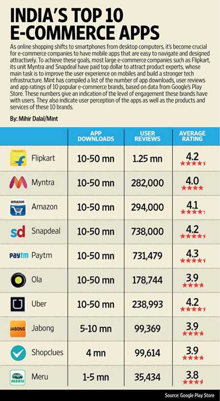 外媒“live mint”近日的报道中了解到, Mint网站根据Google Play的数据,得出了印度最受欢迎的10种电商app,并且分别列出了这10个app的下载量、用户评论和app评分这三个数据: