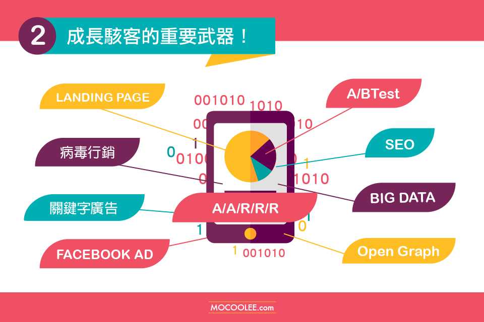 AAARRR 指標模型、A/B 測試 、關鍵字 SEO、數據分析、登錄頁、電子郵件銷售等等……