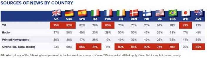 虽然说电视仍然是最常用的新闻接触来源,但年轻人更倾向于在线新闻。而且,调查发现,有很大一部分年轻人已经彻底不看电视新闻了,这一点在美国、法国和丹麦的35岁以下人群中特别显著。在美国35岁以下的用户中,只有24%的人收看电视新闻节目,而在德国这一数字是58%。