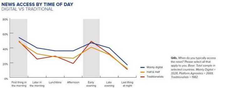 经典的新闻消费曲线正在被新的移动设备改变,它使得新闻接触变成了全天候的。通过收集这12个国家的数据,我们看到重度数字用户的消费曲线比传统使用者要平缓得多(即在不同时段变化不大)。而对于传统使用者来说,早晨、午饭时间和晚上是新闻接触的高峰。