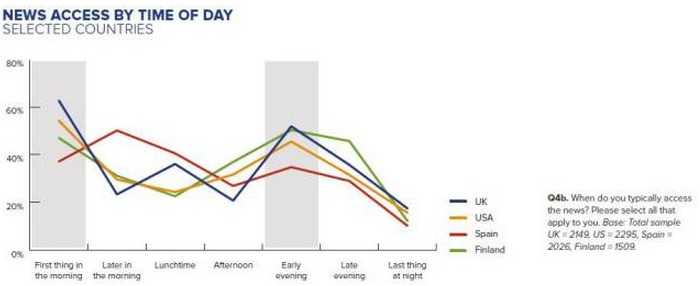 有趣的是,我们看到了不同国家间的差异。英国的曲线与主要广播和电视新闻播出时间一致,说明它有很高比例的传统使用者;西班牙的开始和结束时间都略晚,下午时段有一个明显的低谷,显示出我们对这个国家的刻板印象也许是对的;芬兰的主要电视新闻节目分布于傍晚,导致他们消费曲线的峰值出现的略晚。