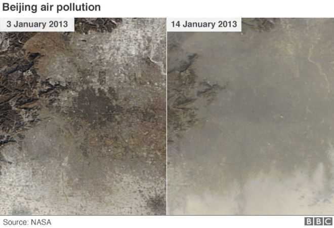 首都北京雾霾尤其严重,2013年美国航空航天局的卫星图片显示,2013年一月雾霾天气恶化,右边照片显示灰褐色的雾霾笼罩了北京城的大半部分。中国试图减少污染,关闭了数千个燃煤厂,尽管如此,2014年全国74个最大城市中只有八个达到了政府的基本空气质量标准。