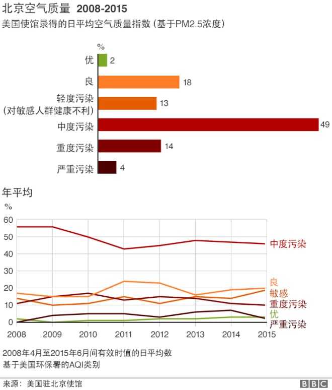 美国驻北京大使馆2008年开始收集空气污染数据,数据显示,大部分时间北京的空气都是污染和严重污染,尽管污染天数开始减少。
