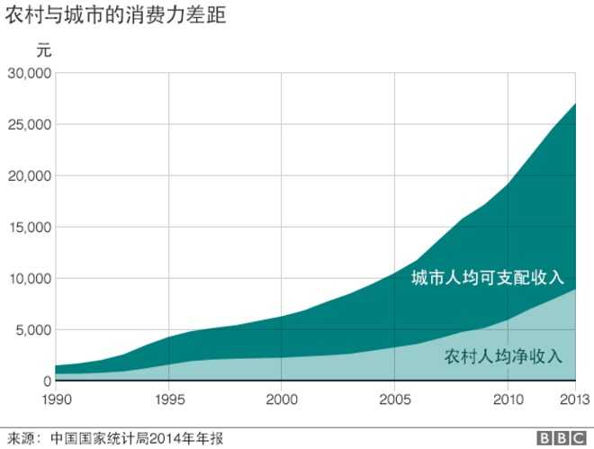 尽管人均收入增多,但不是人人获利,1990年以来,城市和农村的人均可支配收入差距拉大。