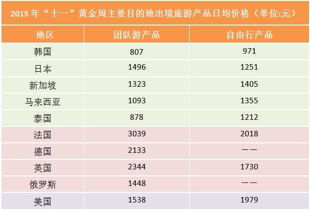 在国庆黄金周的团队包价旅游产品(含大交通)中,日均价格排名前三的国家(地区)为:法国、夏威夷、马尔代夫,日均价格分别达3039元、2689元和2645元。团队游产品中日均价格最低的为韩国产品,日均价格为807元。
