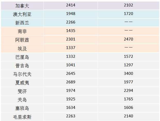 自由行产品中,日均价格最高的为马尔代夫产品,日均价格达3400元,其次为阿联酋和斐济产品,日均价格分别为2470元和2294元。价格最低的依然为韩国产品,日均价格为971元。