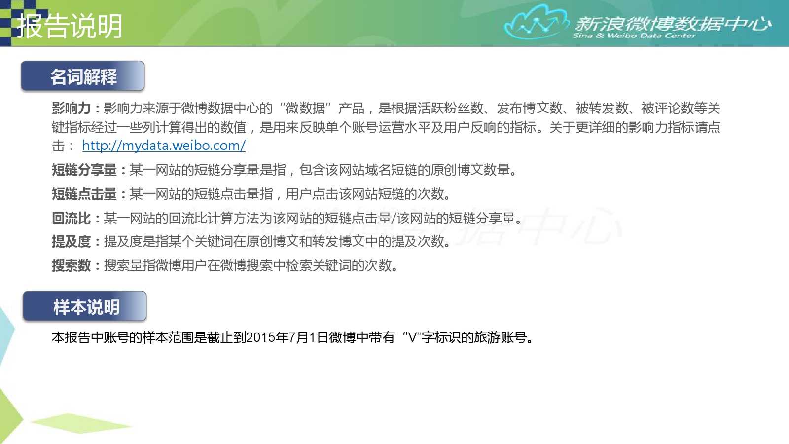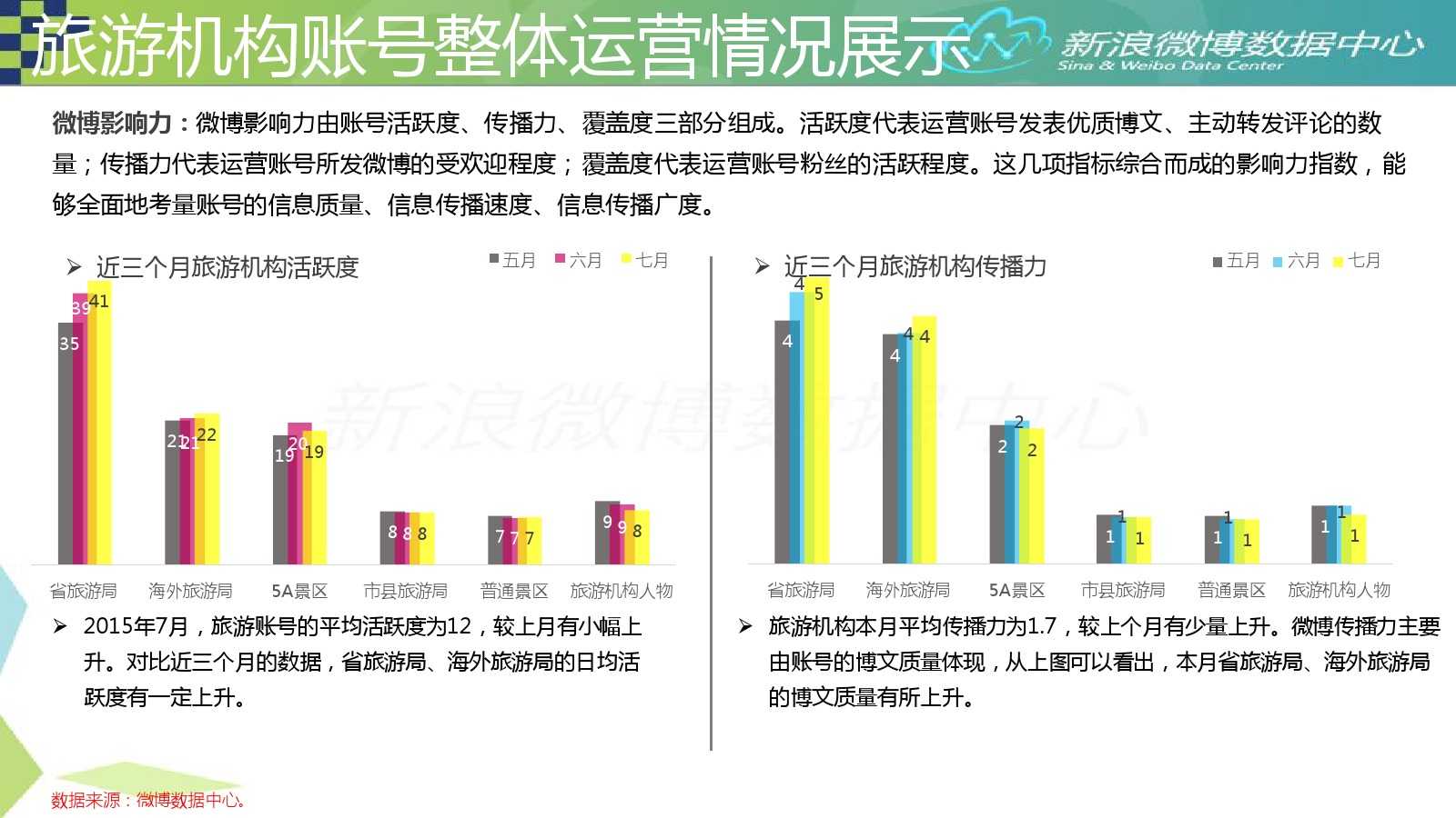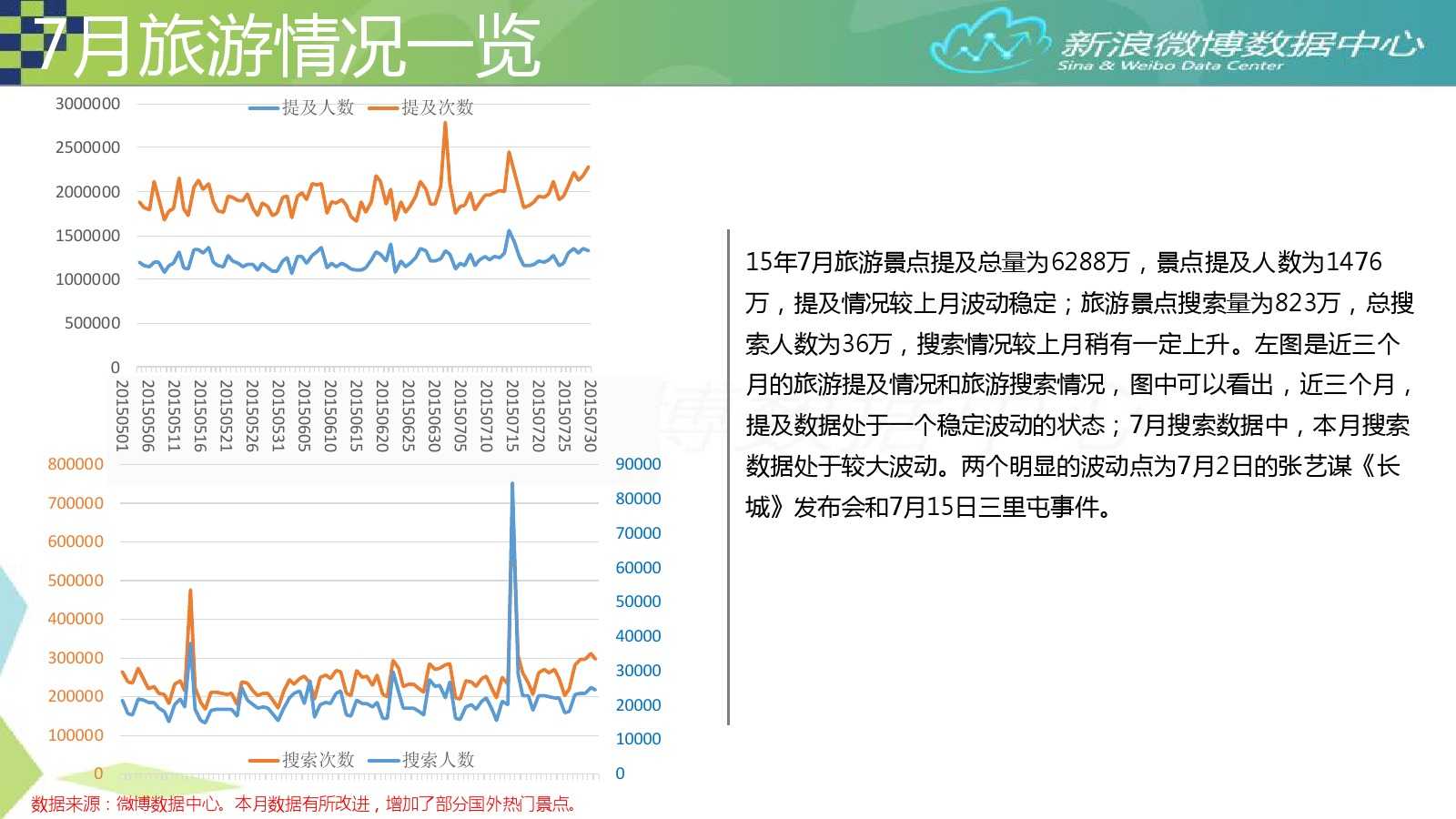 2015年7月旅游微博发展报告 主要包括:旅游信息量的变动分析;旅游用户的分布分析;旅游运营账号的影响力分析、账号排名、省市社交资产解析与对比;在展示数据的环节上突出历史数据对比展示,让数据变动看上去更加直观,更利于理解数据。 更多阅读:2016年海南地区旅游地产发展报告2016-2017年中国旅游地产发展报告美团:2022米粉品类发展报告2018-2020年金盾榜发展报告CCAGM&冯氏集团:2019-2020年中国百货零售业发展报告亚洲金融发展报告:普惠金融篇互链脉搏研究:2020中央企业区块链发展报告微播易&中国传媒大学:2020年中腰部KOL营销发展报告商务部:中国数字服务贸易发展报告 2018中国旅游研究院:2019中国国民休闲发展报告中国石化:2019中国能源化工产业发展报告中国百货商业协会:2018-2019年度中国百货零售业发展报告Microcare:2020云测试行业发展报告2019年云南省咖啡产业发展报告商务部研究院:2020年中国消费市场发展报告