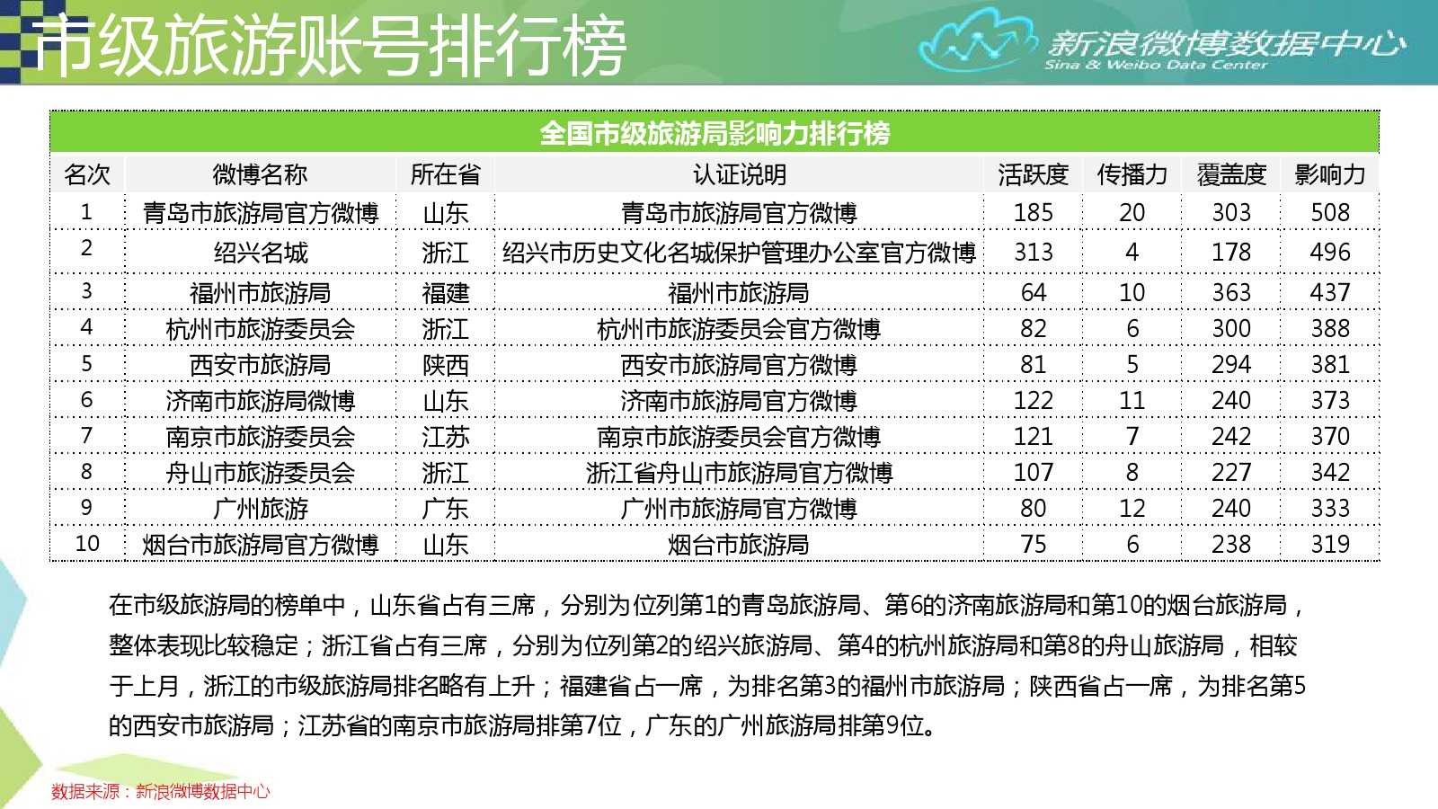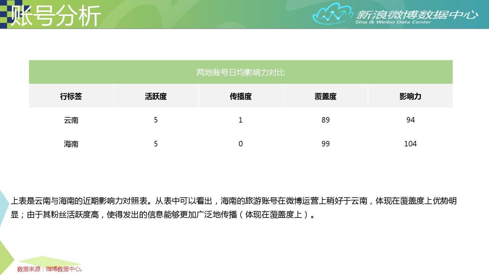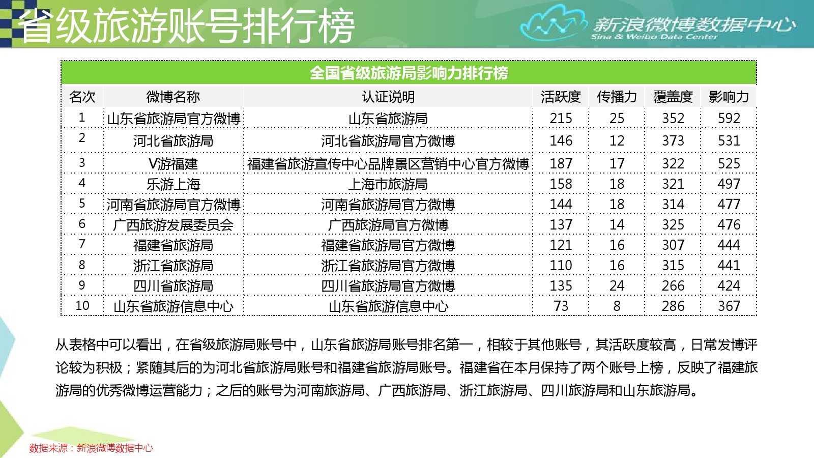 2015年7月旅游微博发展报告 主要包括:旅游信息量的变动分析;旅游用户的分布分析;旅游运营账号的影响力分析、账号排名、省市社交资产解析与对比;在展示数据的环节上突出历史数据对比展示,让数据变动看上去更加直观,更利于理解数据。 更多阅读:2016年海南地区旅游地产发展报告2016-2017年中国旅游地产发展报告美团:2022米粉品类发展报告2018-2020年金盾榜发展报告CCAGM&冯氏集团:2019-2020年中国百货零售业发展报告亚洲金融发展报告:普惠金融篇互链脉搏研究:2020中央企业区块链发展报告微播易&中国传媒大学:2020年中腰部KOL营销发展报告商务部:中国数字服务贸易发展报告 2018中国旅游研究院:2019中国国民休闲发展报告中国石化:2019中国能源化工产业发展报告中国百货商业协会:2018-2019年度中国百货零售业发展报告Microcare:2020云测试行业发展报告2019年云南省咖啡产业发展报告商务部研究院:2020年中国消费市场发展报告