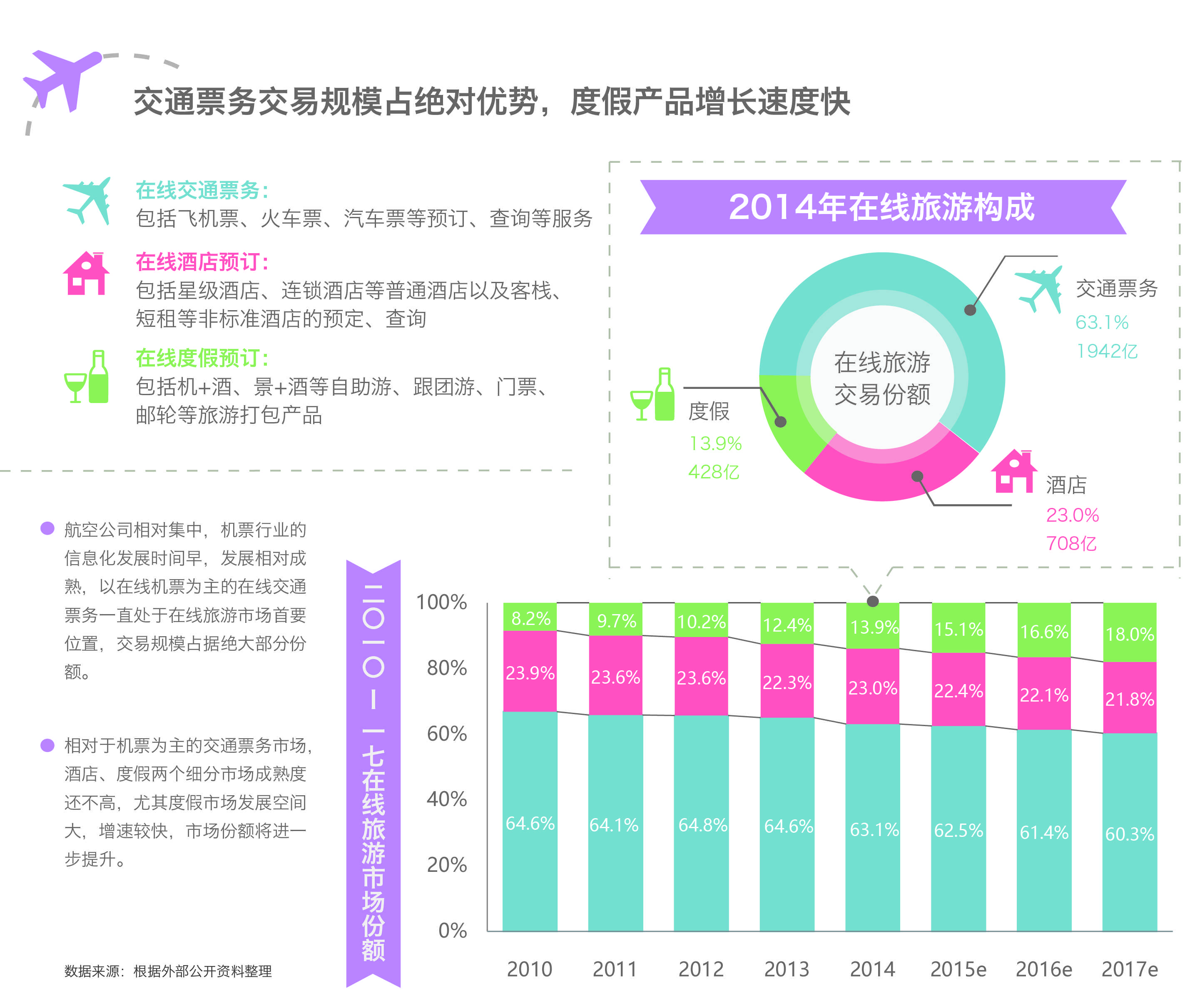 在线旅游行业目前形成了以交通票务、住宿服务及旅游度假在内的三大细分领域市场。以机票为主的交通票务市场占据最主要的份额,而度假产品目前保持最高速的增长,比重将不断攀升。