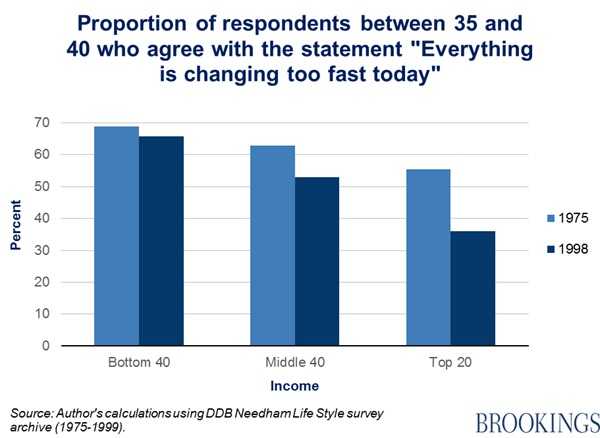 上层中产阶级的社会地位既是较高的自信的来源也是其结果,使得他们能够在复杂世界应对自如。调查数据显示不同的收入群体对社会变革的态度差异非常大: