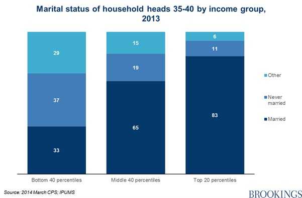 美国社会不仅按收入和教育划分,也按照家庭断层线划分。围绕富裕、受良好教育的美国人与其他美国人之间婚姻差异有很多讨论。上层中产阶级结婚比例是其他人的两倍。当然了,婚姻能够提高家庭收入。在地层40%的美国人中(35到40岁)不结婚的比例(37%)比结婚的(33%)比例还高。而在上层中产阶级中,大部分户主已婚(83%),只有11%从未结过婚: