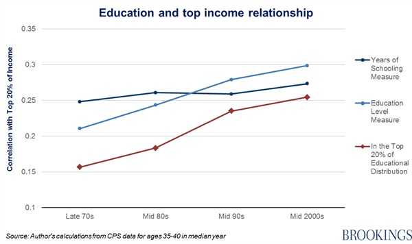 最近几十年,劳动力市场教育回报率有所增长。教育和家庭收入的关系越来越紧密,上层中产阶级家庭收入和教育联系也越来越紧密。我们调查了上层中产阶级教育三个维度:受教育年限、受教育程度、教育分布的前1/5。