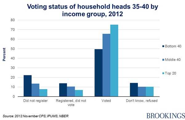 富裕人群对美国政治的影响广受关注,Trumps 、 Kochs 和 Buffetts有财力支持总统选举,上层中产阶级对政治也有强大的影响力。他们投票、组织、游说、抱怨:他们的声音是有影响力的。调查显示这些高收入者更愿意参与投票。2012年,3/4的高收入家庭户主参与了投票,而底层家庭只占一半: