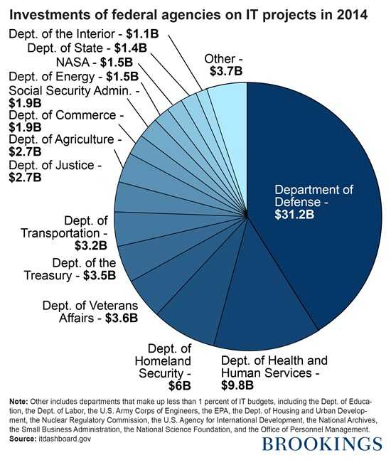 原有系统:大部分政府IT系统是十几年前开发的,自那时就没再更新过。就像老爷车,维护这些系统随时间流逝变得更昂贵。70%的政府IT预算用于维护原有系统,有些还用通用商业语言运行的(COBOL),这个项目语言是在1959年开发的。因为新系统不能和原有系统交互,使得更有效而成本低廉的IT解决方案变得不可行。私营企业则可以定期更新IT系统,因为他们规模小、掌握着不那么敏感的信息。现代IT系统非常奢华,能让私营企业在较短的时间里以较低的成本管理新的IT项目。