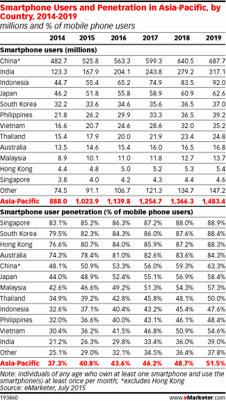 智能手机采用将继续增长,eMarketer预测2015年亚太地区40.8%的手机用户使用的是智能手机,但是不同国家的手机普及率差异很大。2015年亚太地区智能手机用户将超过10亿。到2019年该地区智能手机在手机用户中的比例将达到51.5%,届时智能手机用户将达到14.8亿。证据显示中国智能手机市场增速正在放缓,印度将成为智能手机增长最有潜力的国家。本地制造商生产的廉价设备和服务成本的下降将推动亚太地区智能手机的增长。