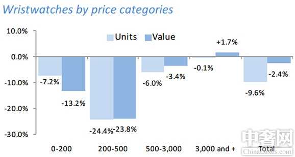 价值在200瑞士法郎(约1309元人民币)以下的,出口量下跌7.2%,出口额下跌13.2%。而价值200-500瑞士法郎(约1309-3273元人民币)的跌幅最为严重,手表出口量跌至24.4%。价值为500-3000法郎(约3272-2万元人民币)的,出口量下跌6.0%,出口额下跌3.4%。可喜的是,超过3000瑞士法郎(约2万元人民币)高端表的出口量下跌0.1%,出口额有1.7%的增长。