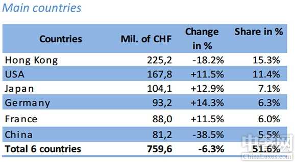 8月瑞表出口在亚洲地区而言,受反腐经济放缓等原因,香港和中国内地市场依旧表现疲软。作为瑞表出口第一大市场的香港有18.2%的跌幅,相对7月28.7%的跌幅而言,情况还是有所好转。中国内地8月的38.5%的跌幅与7月相比差距并不大,但排名上升了一位排至第六。因日本游客上涨因素,8月日本市场有了12.9%的增长至1.041亿法郎。另外,阿联酋和台湾地区同样有了19.1%和20.8%的增长。