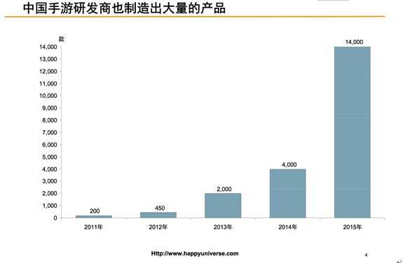 中国游戏市场正在经历同样的发展。2014年,中国大约有4000家游戏开发商。2015年,Happy Universe只能用成千上万或更多来估算开发商的数量,尽管内容提供商数量约增加了250%。