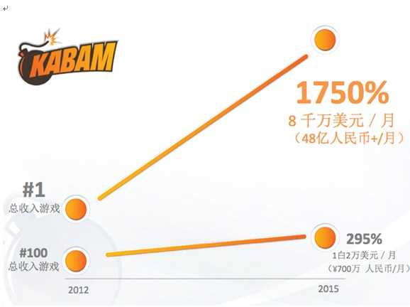2011年至2013年,美国移动游戏市场经历了快速的增长,Kabam亦是如此。2012年,Kabam开发的游戏不仅荣登总收入排行榜榜首,而且还成为了iOS平台上最畅销的应用。在这三年里,随着游戏公司如雨后春笋般出现,大量资本涌向移动游戏市场。包括Kabam在内的很多游戏公司从Facebook平台转向了移动游戏平台,这意味着移动游戏开发走上了复兴之路。