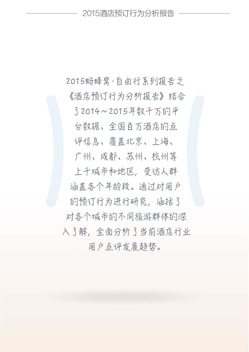 蚂蜂窝旅行网发布了2015《酒店预订行为分析报告》。报告结合蚂蜂窝8000万用户对全球916702家酒店的点评、酒店攻略以及酒店相关的游记、关键词搜索、自由行产品销售数据等,分析了中国游客的酒店预订行为、酒店预订发展趋势。