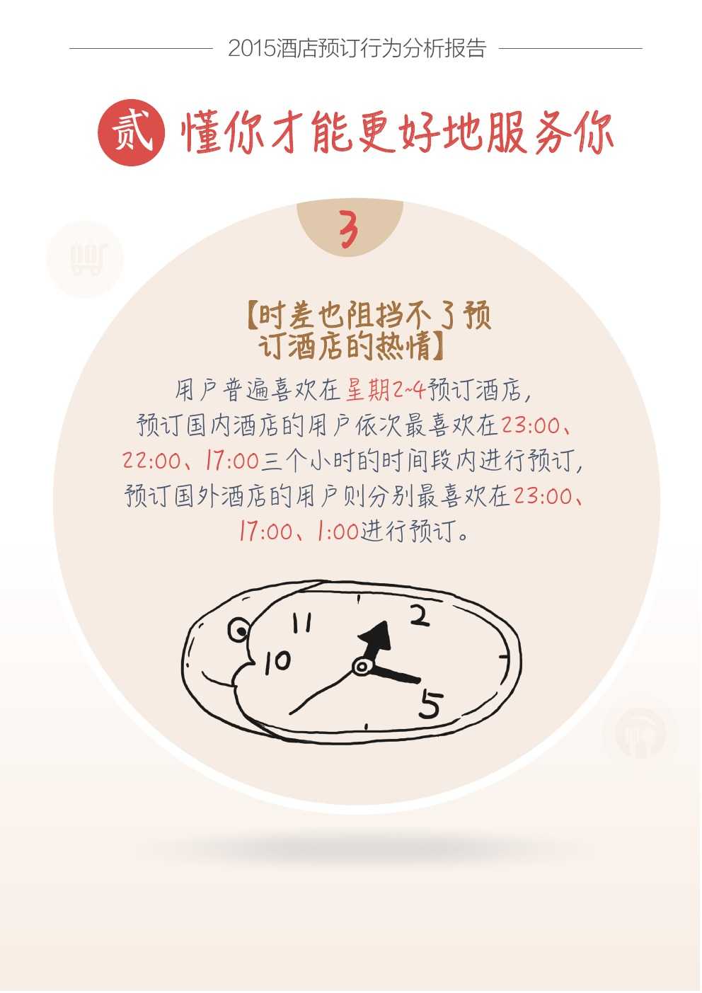 自由行用户喜欢在星期2~4预订酒店,预订国内酒店的用户依次最喜欢在23:00、22:00、17:00三个小时的时间段内进行预订,预订国外酒店的用户则分别最喜欢在23:00、17:00、1:00进行预订。