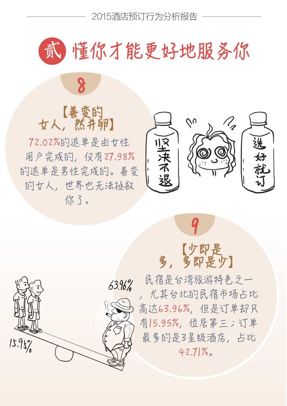 蚂蜂窝数据显示,72.02%的酒店预订退单是由女性用户完成的,仅有27.98%的退单是男性完成的。