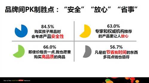 妈妈们对品牌的兴趣来自于对产品质量和安全的关注。网上调查发现,84.5%的妈妈表示”购买孩子用品时会考虑产品安全性”;有66%表示”即使价格贵一点,我也愿意购买高品质的商品。”