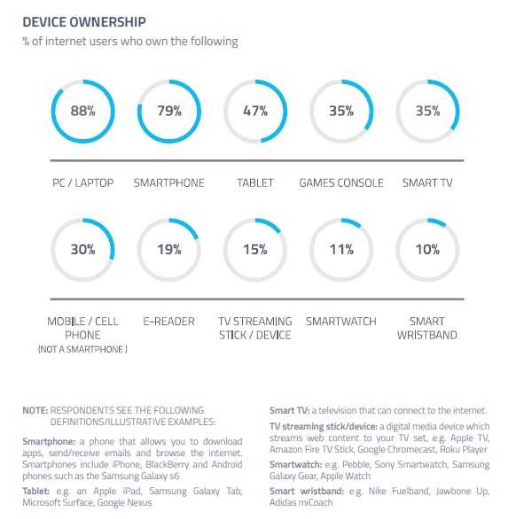 PC和手提电脑仍然是拥有量最高、最常用的设备,但是80%的用户拥有智能手机,近50%的用户拥有平板。虽然变化的速度和规模不应当被夸大,但是PC访问的网页在下降,而移动网页访问则持续上升。