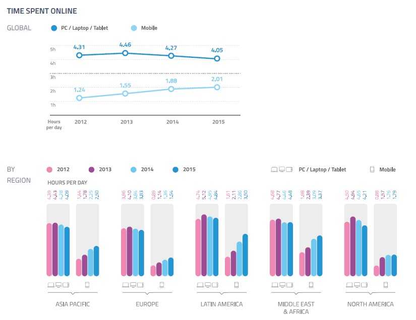 移动网站日访问时间已经超过2小时大关,拉丁美洲领先,每天访问时长3.5小时。