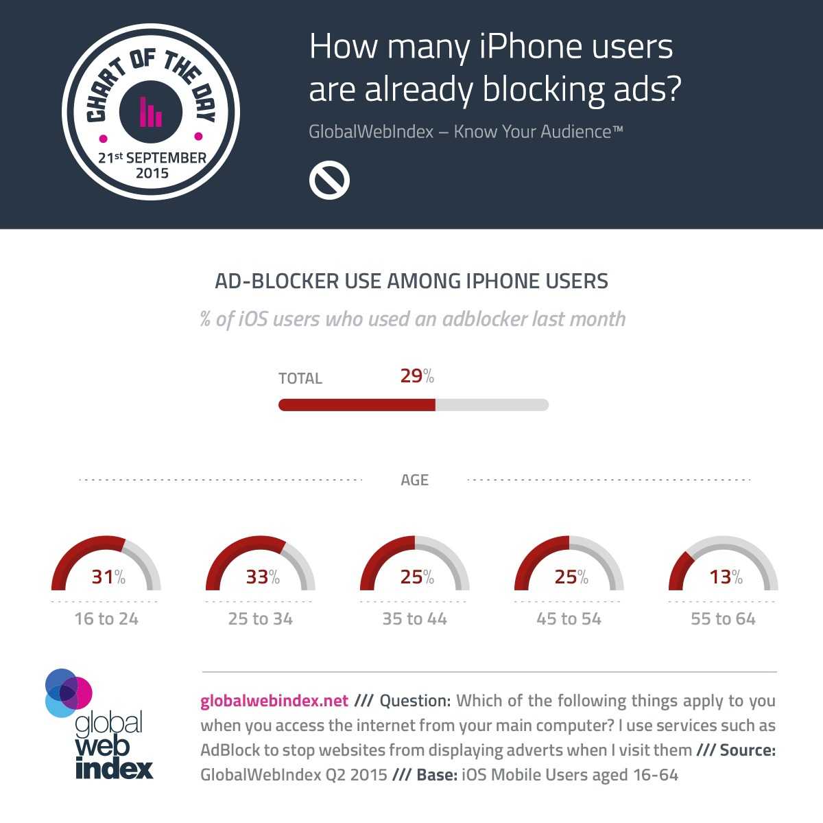 Apple的iOS 9更新让用户有能力拦截移动网站广告,下图显示了多少iPhone用户已经在PC/手提电脑上使用广告拦截应用。