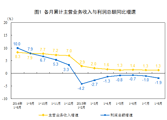 1-8月份,全国规模以上工业企业实现利润总额37662.7亿元,同比下降1.9%,降幅比1-7月份扩大0.9个百分点。