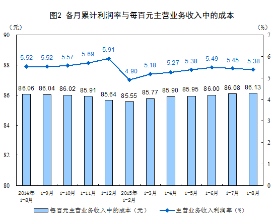 1-8月份,规模以上工业企业实现主营业务收入699743.4亿元,同比增长1.3%;发生主营业务成本602670.7亿元,增长1.4%。