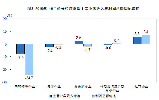 1-8月份,在规模以上工业企业中,国有控股企业实现利润总额7564.2亿元,同比下降24.7%;集体企业实现利润总额299.2亿元,下降0.3%;股份制企业实现利润总额25282.6亿元,下降1.7%;外商及港澳台商投资企业实现利润总额9313.4亿元,增长0.7%;私营企业实现利润总额13319.4亿元,增长7.3%。
