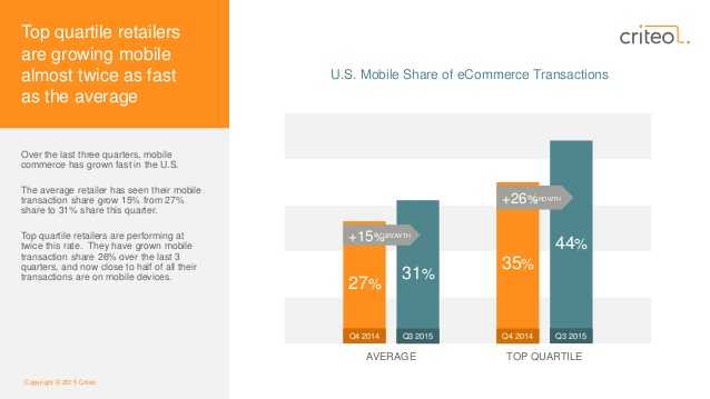 前四分之一的营销商发展移动平台速度是平均值的2倍。平均来看,零售商移动交易份额增长15%(从27%增长至31%);但是前四分之一的零售商移动交易份额同期增长26%。