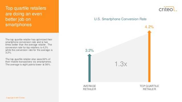 - 智能手机对前四分之一零售商至关重要:前四分之一零售商50%的销售额来自移动平台,主要是由于智能手机较高的转化率。