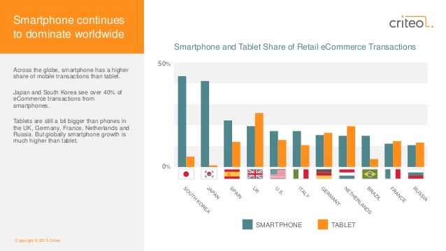 智能手机仍然主宰全球移动电子商务,日本和韩国电子商务交易中超过40%来自智能手机。
