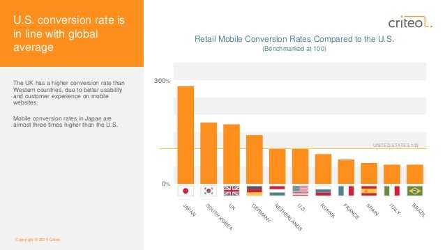 美国转化率保持世界平均水平,日本移动转化率是美国的3倍。