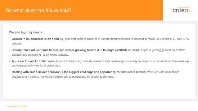 - 应对跨设备行为是2015年营销人员面临的最大挑战,也是最大机遇。40%的交易来自多设备,营销人员必须通过多设备和消费者交流。